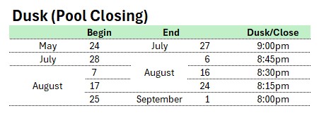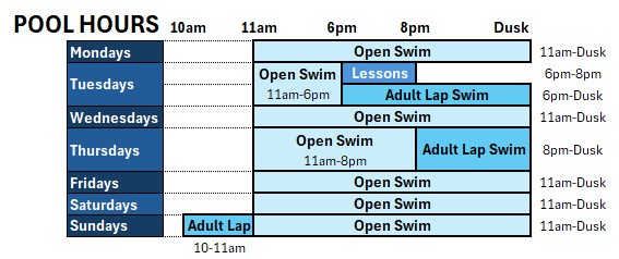 The 2026 pool season is scheduled to open May 23, weather permitting (68°F or warmer). For everyone’s safety, the pool will close during rain, thunderstorms, or when air temperatures fall below 68°F.